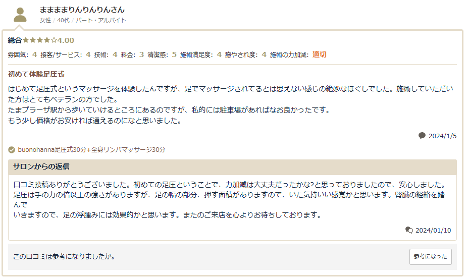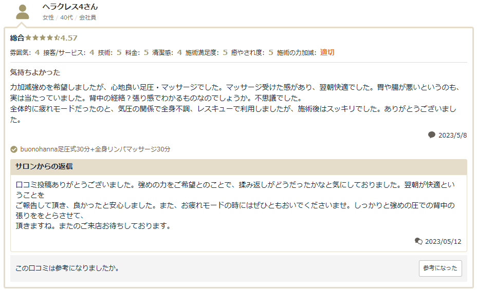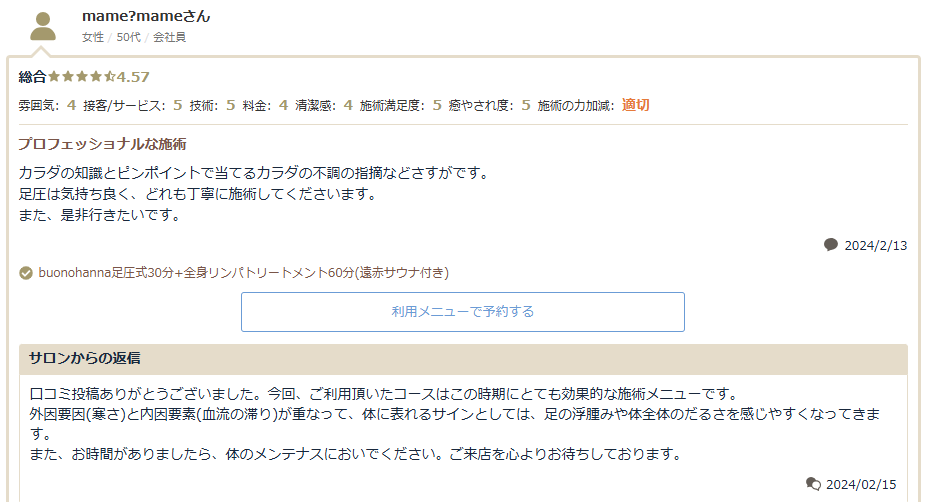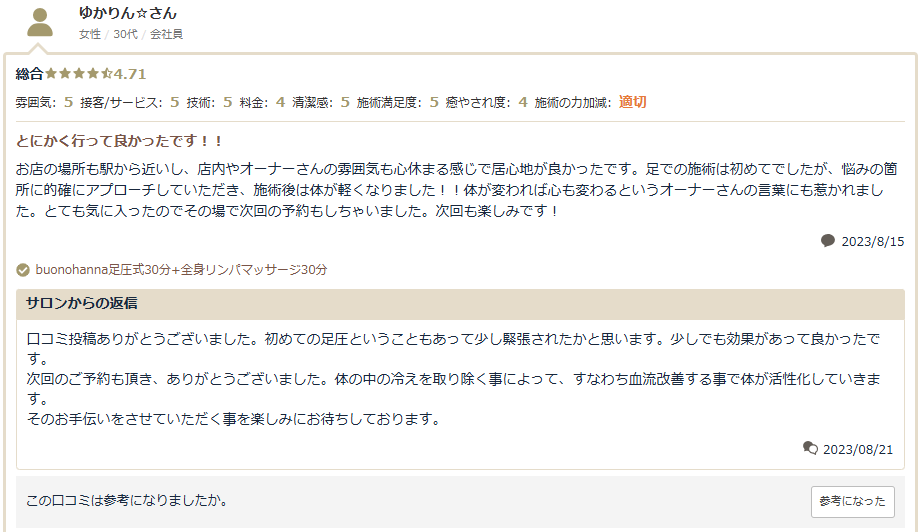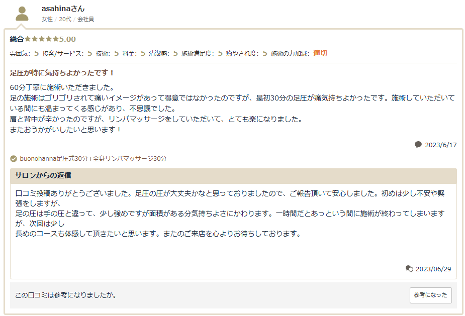 足での施術は力加減が絶妙で、むくみがすーっと取れた感じです。