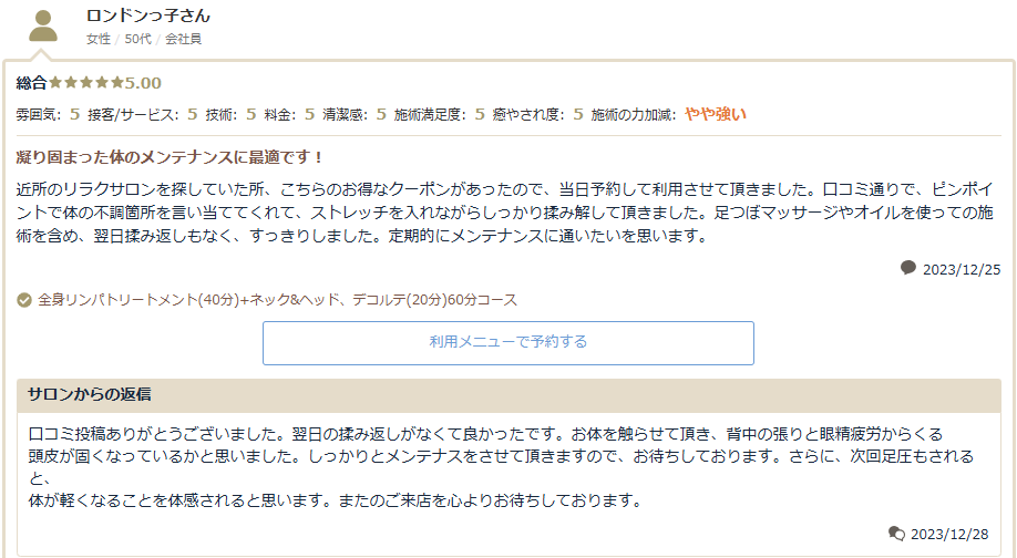 背中や腕、首のマッサージも程よい力加減で、次の日の揉み返しもありませんでした。