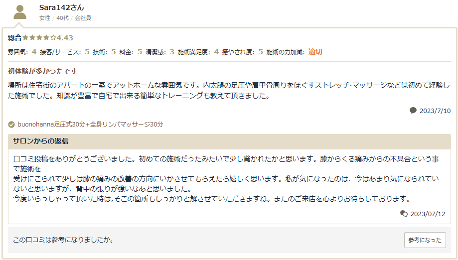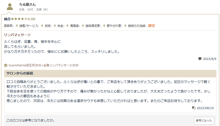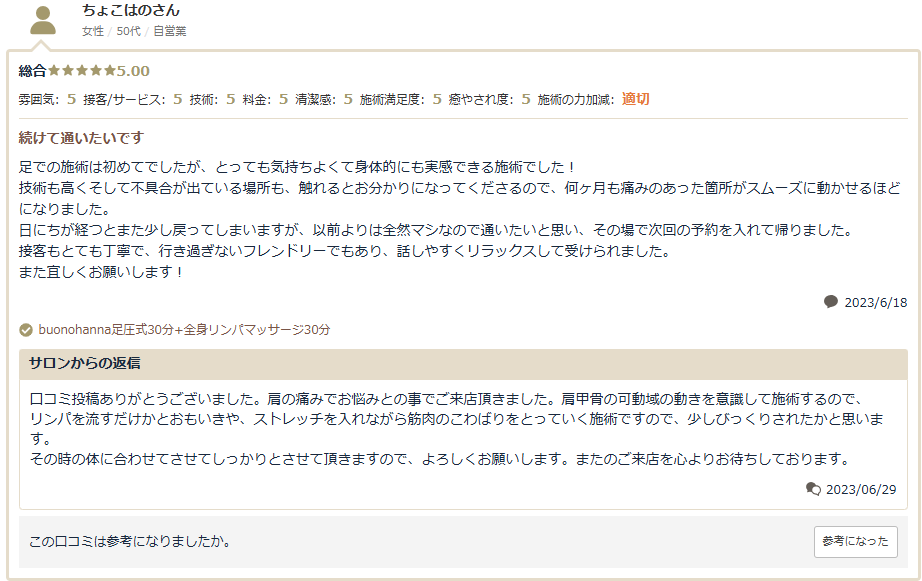 とても知識があるオーナーさんで、リンパマッサージもピンポイントでつらいところを見つけていただき、詰まりを流したら痛みがなくなりました。
